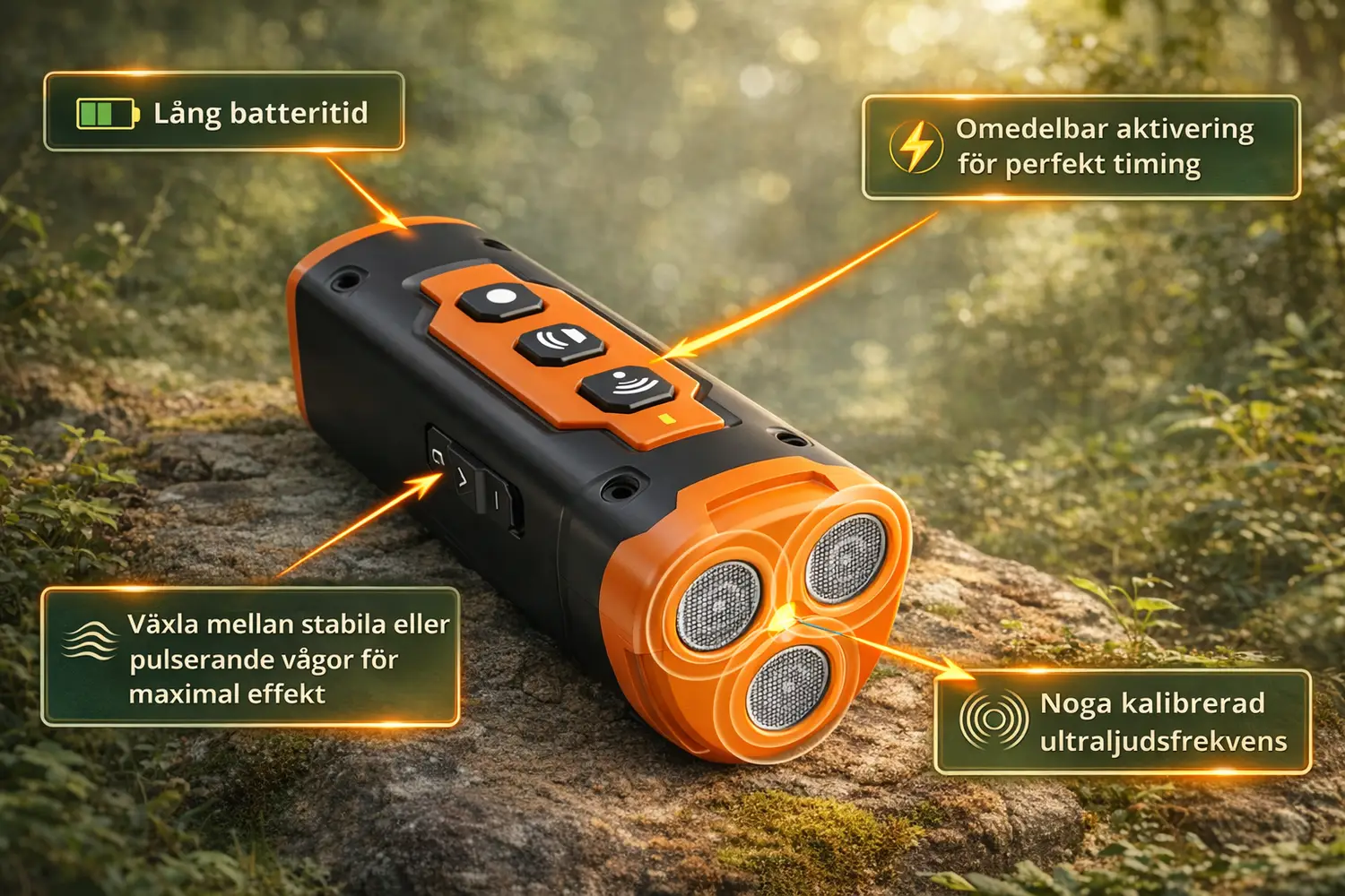 Tänk på det som en osynlig visselpipa. Människor hör ljud upp till ca 20 kHz, men hundar hör långt över det. Vår enhet arbetar i spannet 20-30 kHz. Det är helt tyst för oss, men för hunden är det ett tydligt ljud som bryter deras fokus direkt.